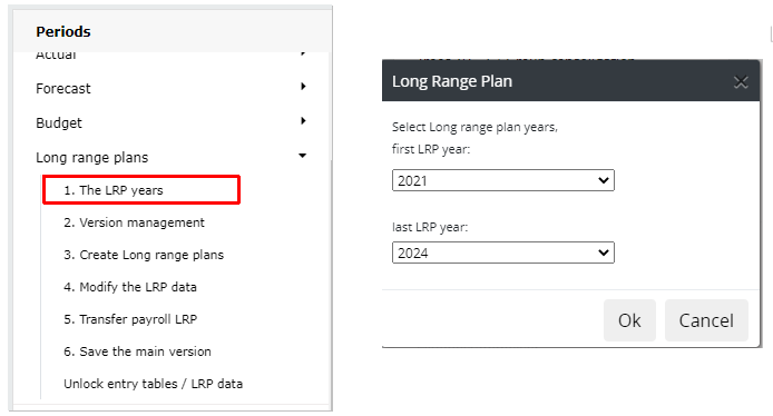 Choose, from the upper drop-down menu, the first LRP-year, and the last from the lower menu. Accept, by pressing OK