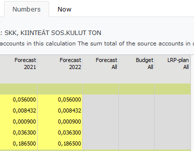 On tabs, the time period (all) column’s grey color indicates, that there are entries for the year(s) of the period. Use right mouse menu on period’s column header to open (close) the group. In the example below, on the Numbers tab, the Forecast is opened.