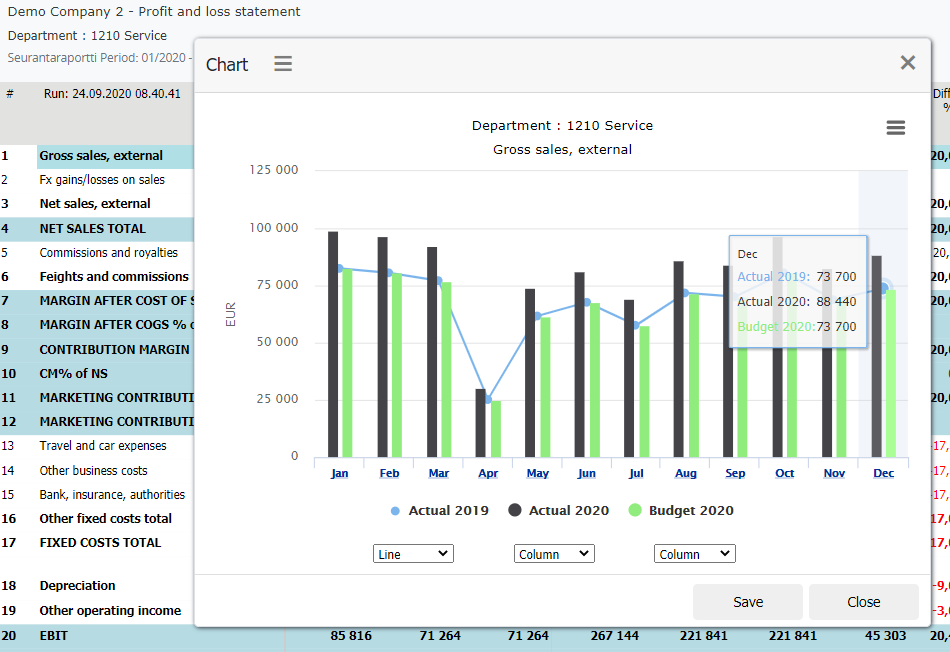 To do a basic chart from a report row, just double-click the row’s text (e.g. account’s text). Another way is to mark the row, click the row text, and then press -button.