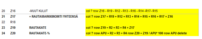 Round 3: (row Z20 = Z19 / APU * 100) Rivi Z20, (laskettu rivi), koostuu rivistä Z19 jaettuna APU rivin arvolla (=R2 + R3 + R4) ja kerrottuna 100. Tulos on %-arvo.