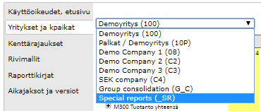 Erikoisraportteja ei voi selata kustannuspaikkoineen puurakenteessa kuten tavallisia raportteja, koska jokaisen raporttirivin yritys ja kustannuspaikka on jo valmiiksi määritelty.