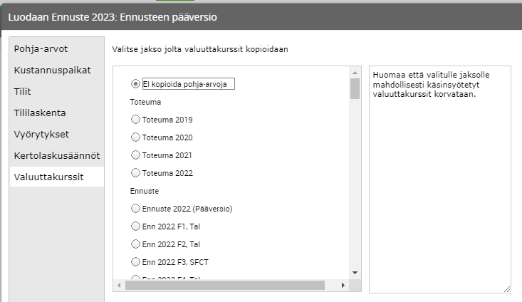 Tarvittaessa kopioi valitsemaltasi aikajaksolta löytyvät Tililaskennat, Vyörytykset (myös valitun aikajakson mahdolliset vyöyrytystaulukoiden prosentit kopioidaan) ja Kertolaskut. Jos järjestelmän käytössä on myös muita valuuttakursseja (kuin oletus EUR), voidaan ne kopioida luotavaan pohjaan.