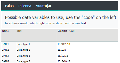 Yleiset datatyypit on oletuksena. Suositus on, että luonnissa käytetään vain oletusvalintoja.
