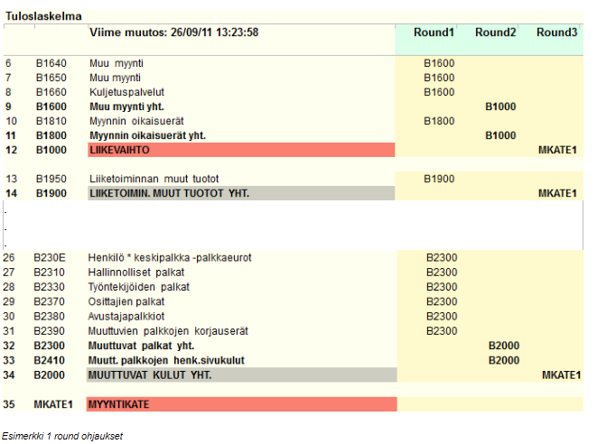 Laskenta etenee siten, että täytät haluamallesi riville Round -sarakkeeseen sen summarivin koodin, johon rivi summataan, lähtien alimmalta tasolta korkeampaan ja siirtyen Round-sarakkeilla vasemmalta oikealle.