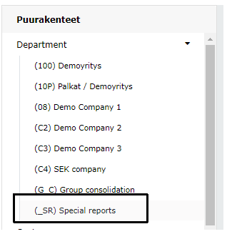 Erikoisraportti: rivi = haluamasi yrityksen / yrityksien ja kustannuspaikan / kustannuspaikkaryhmän tili- /tiliryhmäyhdistelmä tai näistä laskennalla tuotettu luku.