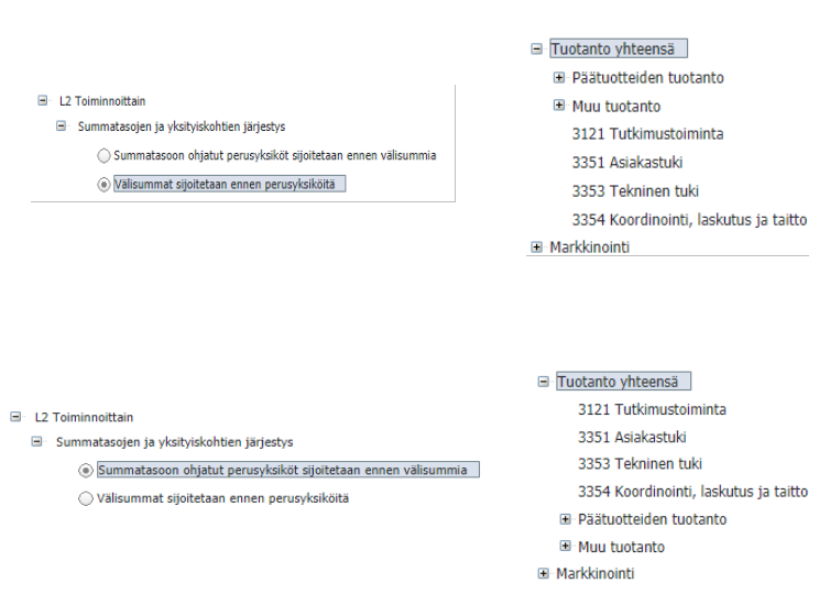 Asetukset valikosta määritellään puurakenteen yksiköiden ja välisummien järjestys. Valinta on puurakennekohtainen.
