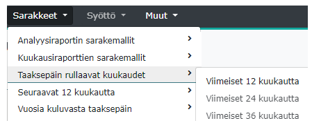 Valitut toteumavuodet määrittelevät myös selailun taaksepäin rullaavien kuukausien valinnat. Esimerkissä alla aktiiviksi vuosiksi taaksepäin on valittu vain kuluva vuosi -1, jolloin vaihtoehdot 24 kk ja 36 kk eivät ole valittavissa.