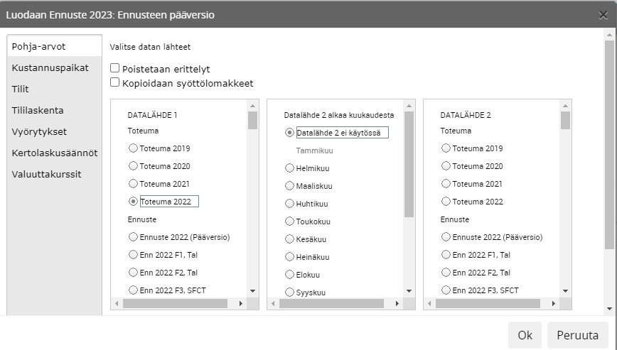 Datalähde 2 -tarvittaessa voi pohja-arvot kopioida kahdesta eri datalähteestä. Esimerkiksi alkuvuoden luvut tuodaan kuluvan vuoden budjetista (datalähde 1) ja loppuvuoden luvut, joltain muulta aikajaksolta alkaen datalähde 2:n valitusta kuukaudesta.