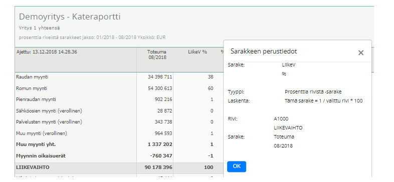 Tarkoituksena on määritellä prosenttia rivistä -sarake. Esimerkiksi, kuinka monta prosenttia valittu rivi on liikevaihdosta valitulla ajanjaksolla.
