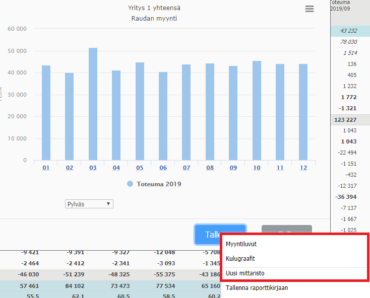 Tee graafi ja tallenna se Mittaristoon painamalla Tallenna. Jos yhtään mittaristoa ei ole vielä tallennettu, valitse Uusi mittaristo. Muussa tapauksessa valitse luettelosta olemassa oleva Mittaristo, johon haluat graafin tallennettavan.