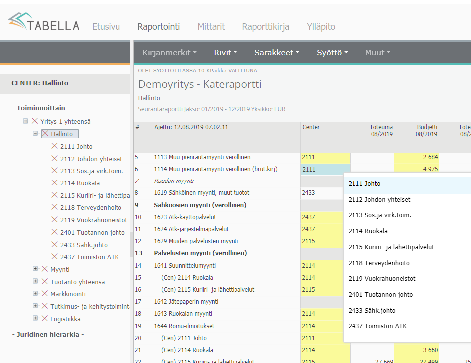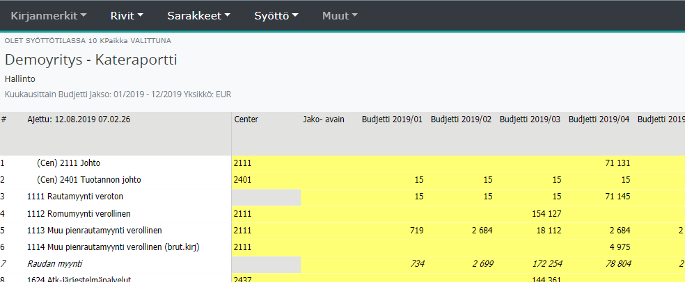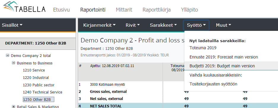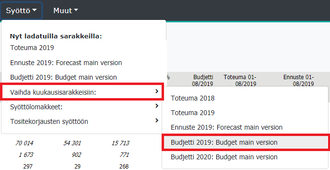 Syöttöön valitaan kuukausisarakkeista Budjetti 2019 pääversio.