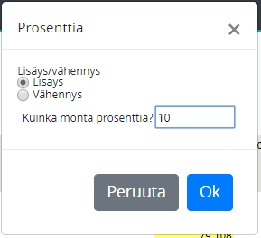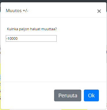Klikkaa syöttöalueen solua hiiren oikealla painikkeella. Muutoksen soluun voi tehdä syöttämällä luvun (+/-), joka vastaavasti lisää / vähentää solun arvoa. Solun arvoon voi tehdä prosenttimuutoksen (muutosprosentti syötetään ilman % merkkiä) tai solun arvon voi nollata. Merkitse useampia soluja hiirellä vetämällä -yhtenäinen alue- tai painamalla ja pitämällä näppäimistön ctrl-näppäintä kun merkitset solut klikkaamalla.