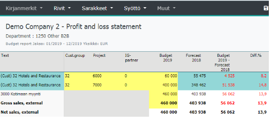 Syöttöön siirtymisestä analyysiraportin sarakemallilla, jossa on syöttöön auki olevia aikajaksoja, Nyt ladatuilla sarakkeilla alla. Tällöin syöttöpohjaan saadaan mukaan esimerkiksi ero-sarakkeita. Esimerkissä ei ole jakoavainta käytössä, jolloin tyhjään riviin budjetin 2019 syöttö jakautuu tasan kaikille kuukausille. Jakoavaimen käyttö selitetty tarkemmin alempana.