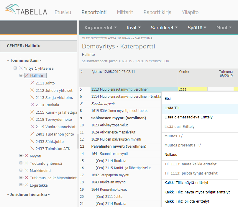 Painamalla hiiren oikean painikkeella rivitekstiä -tilin nimi- avataan valikko, josta tilien lisäämisen lisäksi voi esimerkiksi nollata rivin arvon.