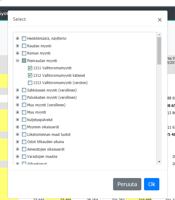 Uusi tili lisätään syöttöpohjaan klikkaamalla rivitekstiä hiiren oikealla-painikkeella. Raporttimalliin ohjatuista tileistä valitaan yksi tai useampi tili/tiliryhmä. Jos syöttöpohjassa ei ole rivejä, niin tilit lisätään, kuten edellä on kuvattu, painamalla rivitekstiä ”Ei dataa” oikealla hiirellä. Esimerkissä alla lisätään syöttöpohjaan tiliryhmästä ”Pienraudan myynti” kaksi valittua tiliä. Tilin lisäysvalikossa näkyy harmaaksi merkittynä kaikki ne tilit, jotka ovat jo lisätty syöttöpohjaan.