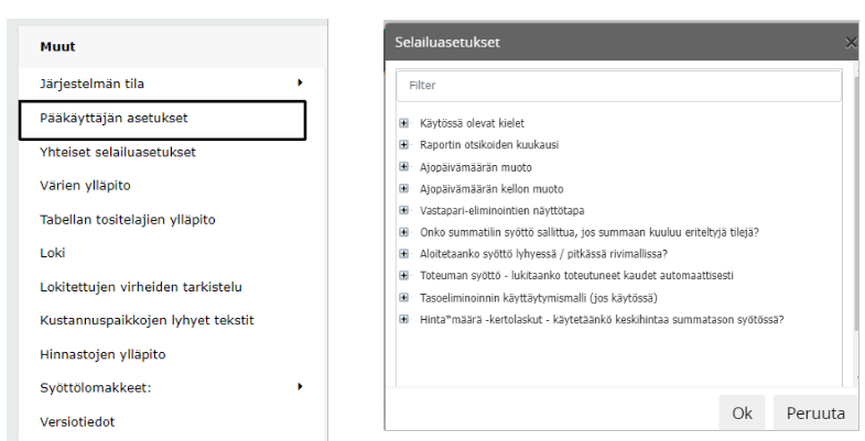Järjestelmäasetukset, joita voi antaa vain Pääkäyttäjä. Asetukset ovat voimassa kunnes ne muutetaan.