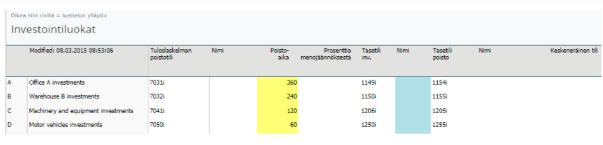 Toiminnossa määritellään investointilomakkeiden tasetilien ohjaukset, joita käytetään lomakesyötössä.