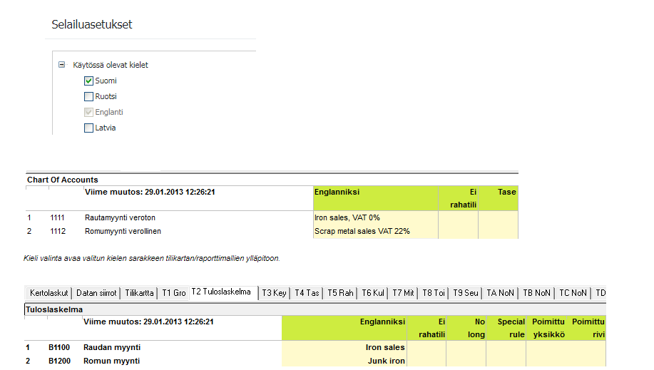 Kieliversion käännöksiä tilikarttaan/rivimalleihin ei ole automatisoitu. Pääkäyttäjän on itse ne tuotava / kirjoitettava.