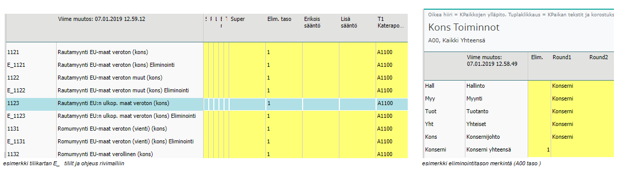 Tilieliminointien tarkenne, jos tilieliminoinnit halutaan nähdä. Tilikarttaan avataan tileille E_ alkuiset tilit. Tilit kloonataan, kertomalla - 1:llä, jolloin alkuperäinen kirjaus säilytetään. E_ -tilit pitää avata tilikarttaan ja ohjata mukaan rivimalliin, muuten raporteilla ei eliminointi toimi.