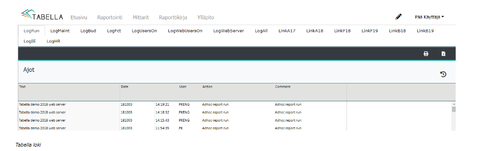 Tabella kerää tietoja käyttäjien järjestelmään tekemistä muutoksista. Loki kerää tiedot: raporttien ajoista, ylläpidosta, budjetin ja ennusteen syötöstä, kirjatuista kommenteista- esim. kommentoitu tiliohjauksiin tehtyjä muutoksia. Lokista näkyy myös järjestelmään tällä hetkellä kirjautuneet käyttäjät, ja Link välilehdissä vyörytysmäärittelyt -käytetyt ohjaukset.