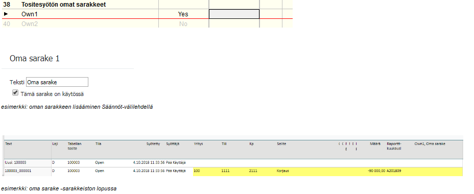 Tositeluettelon lopussa on mahdollisuus määrittää omia sarakkeita tositesyöttöön. Lisää sarake rivitekstin oikean hiiren valikosta, anna sarakkeelle nimi ja klikkaa merkintä Tämä sarake on käytössä.