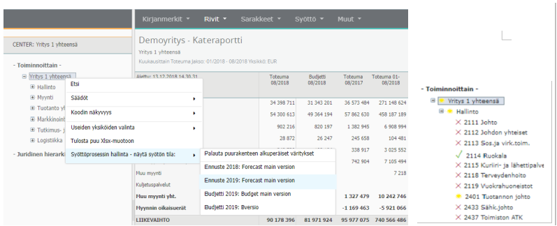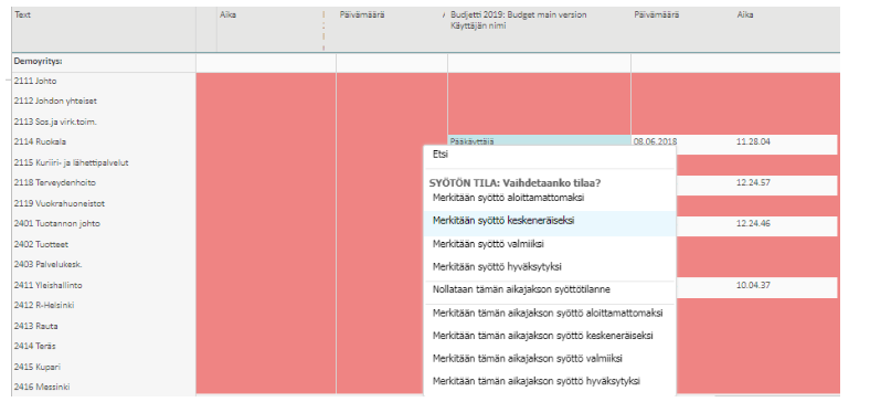 Aikajaksojen ja versioiden ylläpito tehdään samassa taulukossa. Toimintoa voidaan käyttää ylläpidossa sarakkeina olevien aikajaksojen (esim. budjetti / ennuste) syöttöprosessin tilan muokkaamiseen, kustannuspaikoittain -esimerkiksi merkitsemällä syötön valmiiksi.