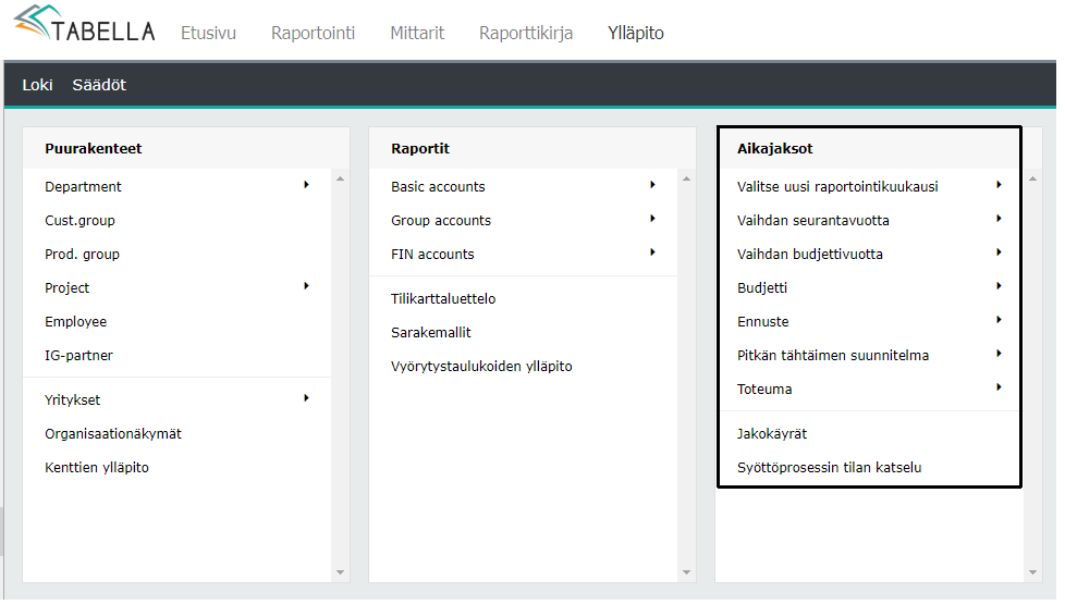Pääkäyttäjä hallinnoi aikajaksoja; toteuma, ennuste, budjetti ja pitkän tähtäimen suunnitelma (PTS). Aikajaksot osassa tehdään kauden vaihdot; vaihdetaan raportointikuukautta, seuranta- ja budjettivuotta.