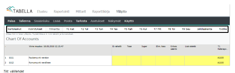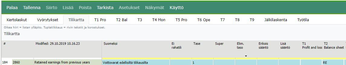 Jos merkintä tasetilistä puuttuu täydennä se tilikarttaan Tase -sarakkeeseen ja tallenna muutokset poistuessasi ylläpidosta. Tämän jälkeen lue kirjanpidon siirtoaineisto uudelleen sisään Tabellaan siitä alkaen, kun ko. tilillä tapahtumia perusjärjestelmässä on, ja aja raportit, jossa mukana ainakin ko. vuoden toteuman luvut.