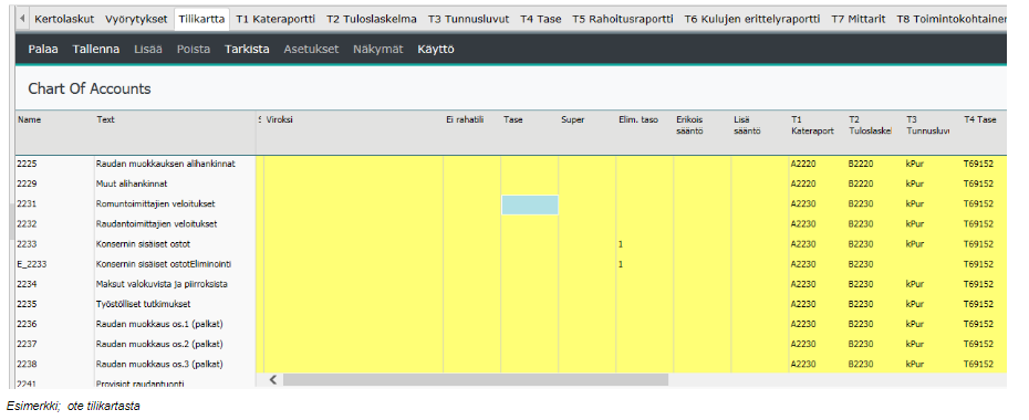 Esimerkiksi, eliminointitasomerkintä 1 on konsernin sisäinen, merkintä 2 alakonsernin sisäinen. Eliminointitaso on sama, joka on merkitty puurakenteen ylläpidon eliminointisarakkeeseen.