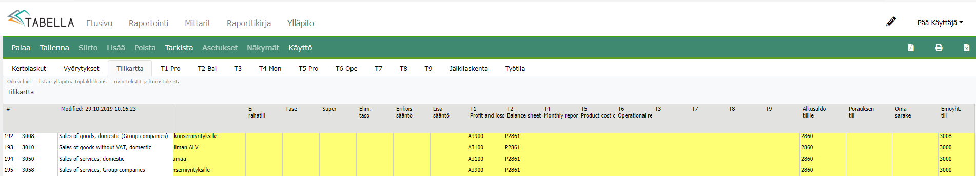 Yhdessä Tabellassa voi olla useita tilikarttoja (max. 9).