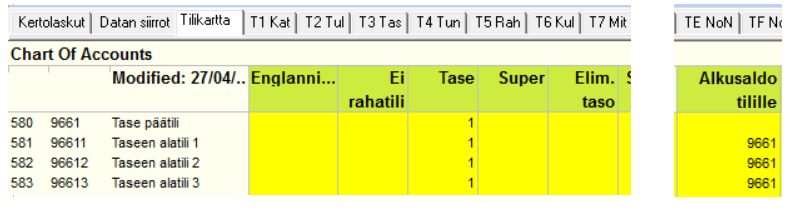 Esimerkki jos käytössä alatasetilejä: