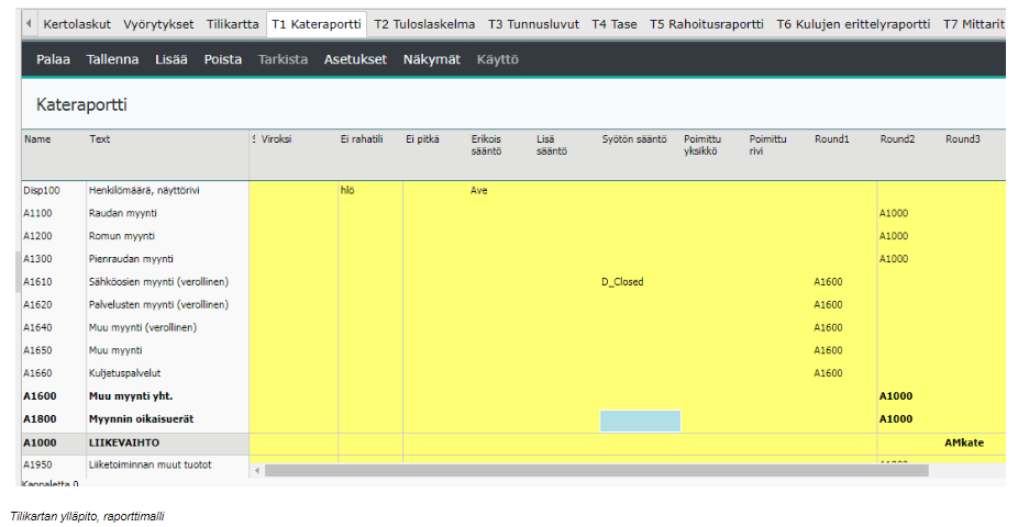 T1…TK – määritellyt rivimallit, jotka muodostetaan ohjaamalla tilejä tilikartasta summariveiksi rivimalliin. Raporttimalleja voi olla yhteensä 35, oletuksena on yhdeksän rivimalli pohjaa auki. Pääkäyttäjä avaa tarvittaessa lisäsarakkeet tilikarttaluettelon ylläpidossa.