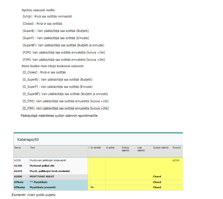 Syötön sääntö –Pääkäyttäjä määrittelee riville (tai lisäksi rivin tileille) syöttösäännöt. Esimerkiksi sulkee ne rivit, joihin ei saa syöttää. Jos merkintää ei ole, voi siihen syöttää normaalisti.