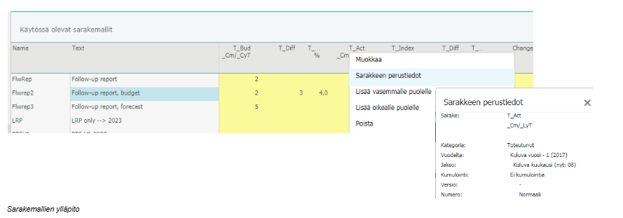 Paina sarakeotsikkoa oikealla hiiren näppäimellä ja valitse Muokkaa. Voit muokata sarakkeen; otsikon ylempää / alempaa tekstiä, leveyttä, käytettäviä viivoja, korostuksia ja näytettävien desimaalien lukumäärää