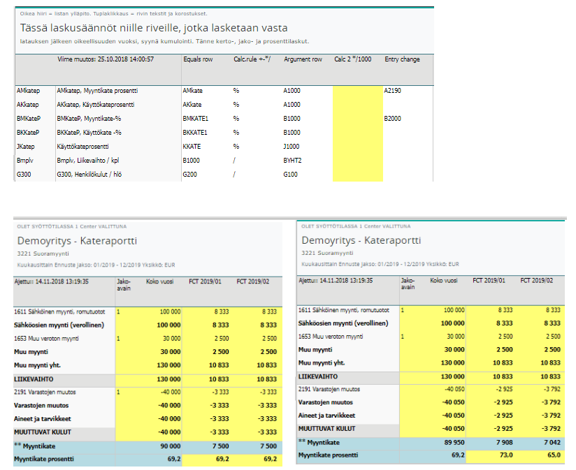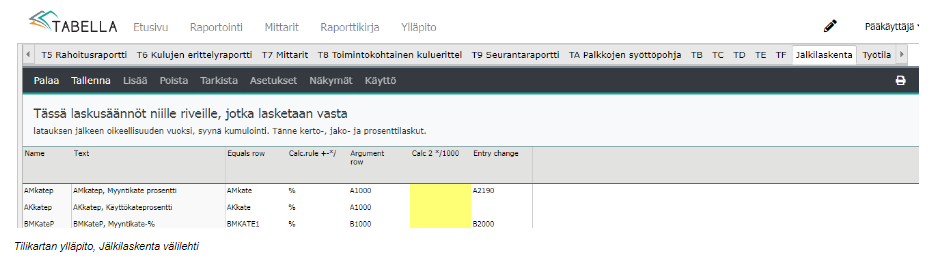 Jälkilaskennassa määritellyt summarivit lasketaan tiedon oikeellisuuden varmistamiseksi, vasta raportin latauksen jälkeen. Laskenta on yhteen-, vähennys-, jako- tai prosenttilaskua.
