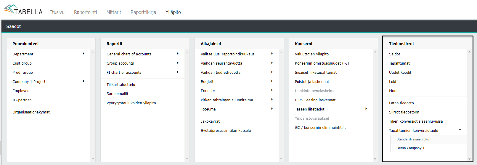 Tiedonsiirrot esimerkiksi kirjanpitojärjestelmästä Tabellaan ja järjestelmän päivittäminen.