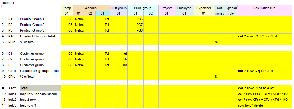 Kun yhteen sarakeryhmään on täytetty koodeja useihin sarakkeisiin, tiedot summataan riville. Esim. kolme tilinumeroa antaa rivisaldona näiden kolmen tilien arvot yhteensä, kaksi kustannuspaikkaa antaa rivisaldona molempien kustannuspaikkojen yhteissumman jne.