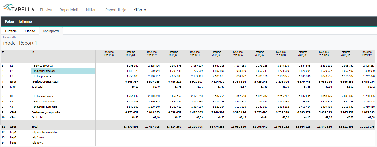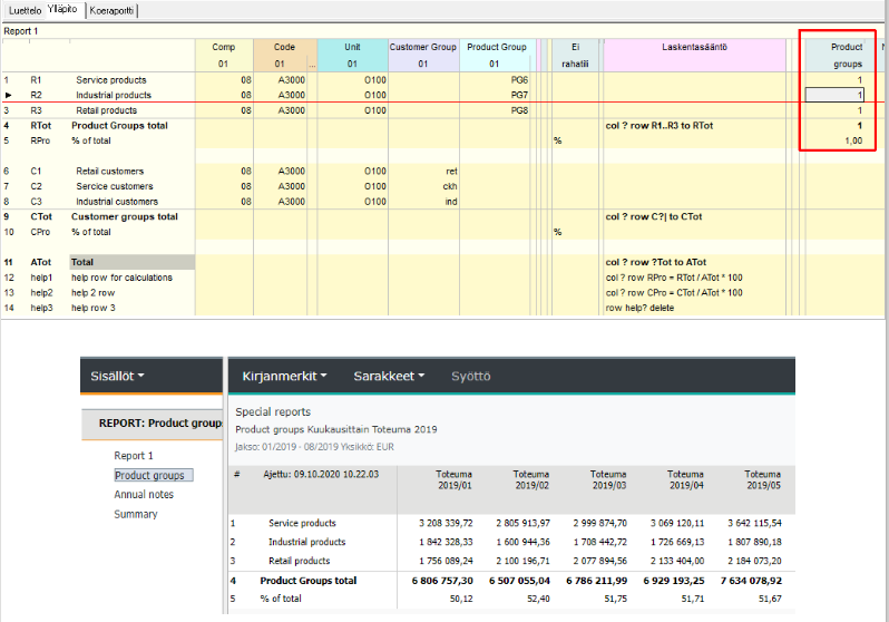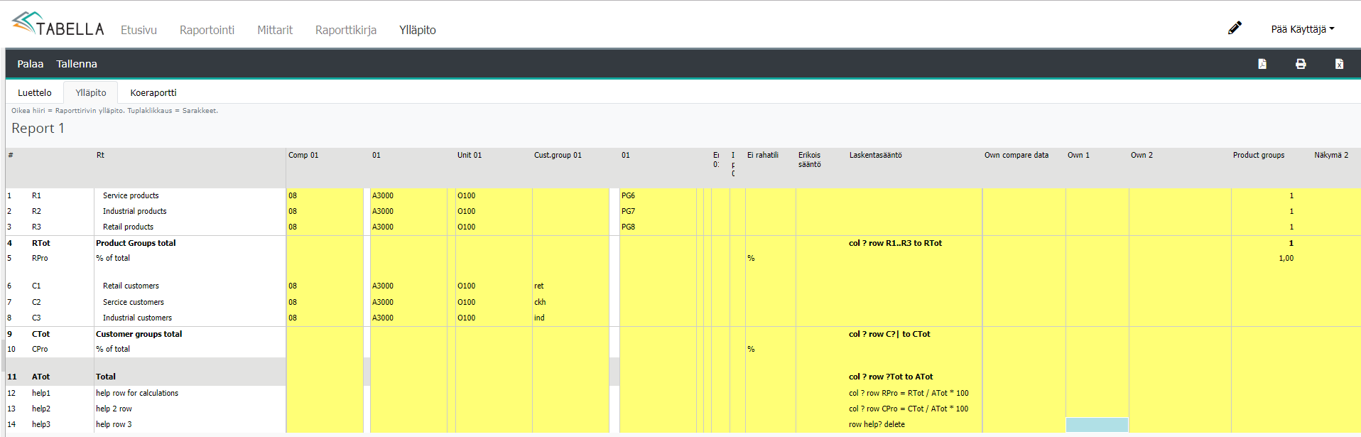 Esimerkissä käytetty help rivejä prosenttilaskuihin. Rivit lasketaan vasta kun raportti on ladattu, jotta lukujen oikeellisuus varmistetaan. Lopuksi Help rivit poistetaan.