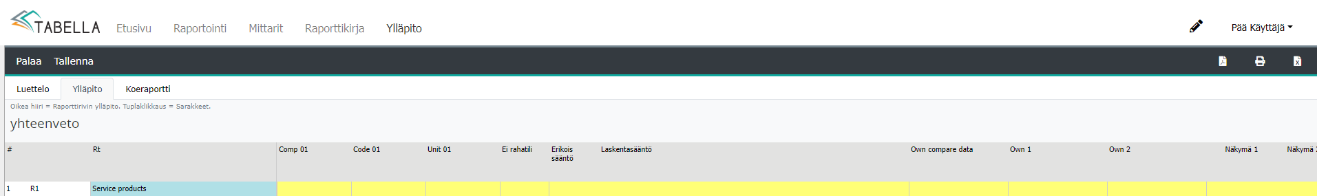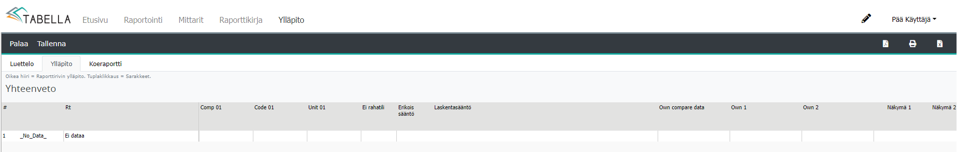 Koeraportti välilehti lataa raportin ylläpitotilassa, sen hetkisillä määrityksillä.