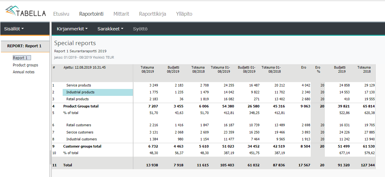 Pääkäyttäjä määrittelee ja ylläpitää erikoisraportit. Raporttien riveille voi yhdistää halutut kustannuspaikat/-ryhmät, yritykset ja tilit. Raporteille voi määritellä raportin sisäisiä laskentasääntöjä ja ne voidaan tallentaa Tabellan Raporttikirjaan. Raporttikirja on lisäosa.