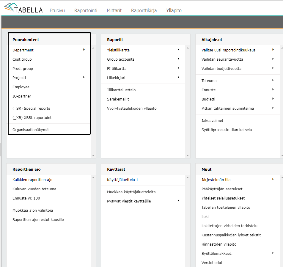 Pudotusvalikossa on kaikki käytössä olevat yritykset ja dimensiot rakenteineen. Jos käytössä on ns. Erikoisraportteja, siirrytään valikosta raporttien määrittelyihin.