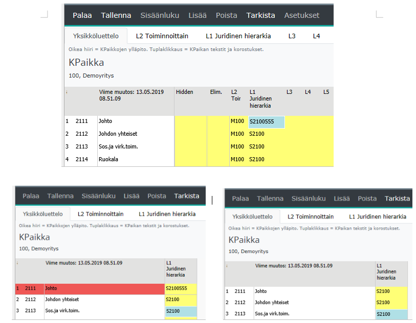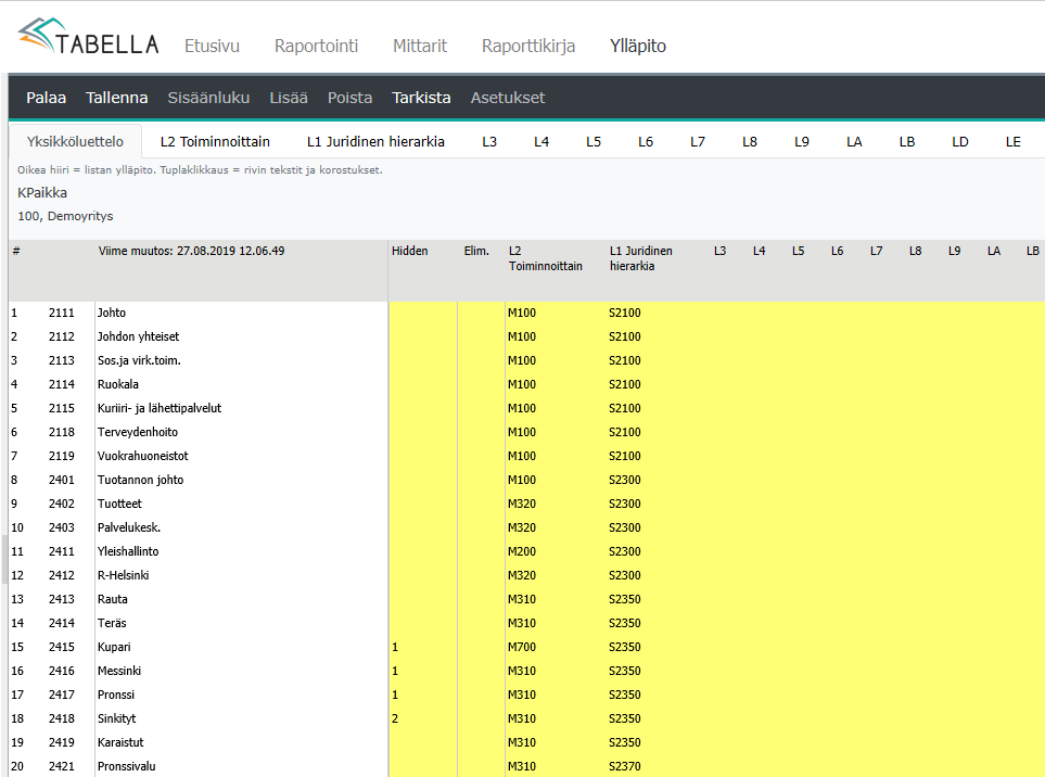 Yksikköluettelo – luettelo sisältää kaikki yrityksen kustannuspaikat ja näiden ohjaukset puurakennepohjiin (L1, L2…välilehdille). Tässä voit lisätä / poistaa / muokata kustannuspaikkoja, ohjata kustannuspaikat kustannuspaikkaryhmiin ja määritellä erikoissäännöt.