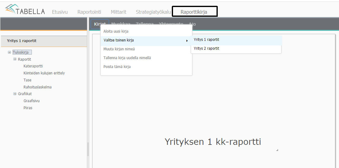 Jos käyttöoikeudet on annettu useampaan Raporttikirjaan, vaihda kirja valitsemalla Kirjat | Valitse toinen kirja | ”Kirjan nimi”