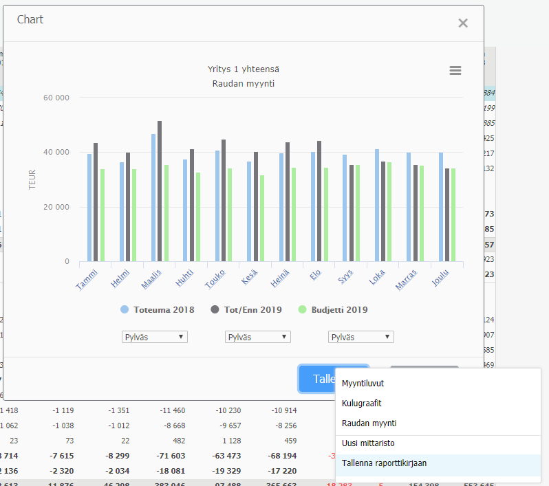 Sivulle lisätyn raportin / graafin oikean hiiren valikosta voi vaihtaa yksikköä, sarakkeistoa ja rivimallia.