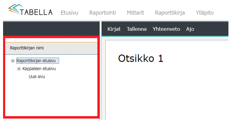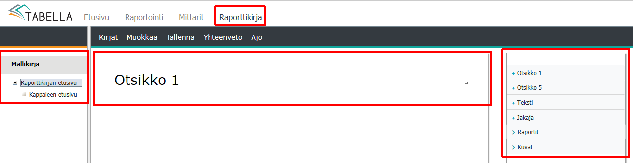 Keskellä on muokattavissa oleva raporttikirjan osa, esimerkiksi sivu