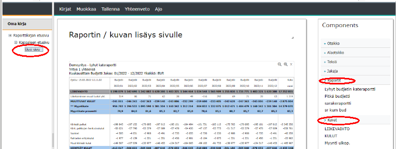Oikealla on komponentit: esimerkiksi tallennetut kuvat ja raportit, joista raporttikirja rakennetaan.