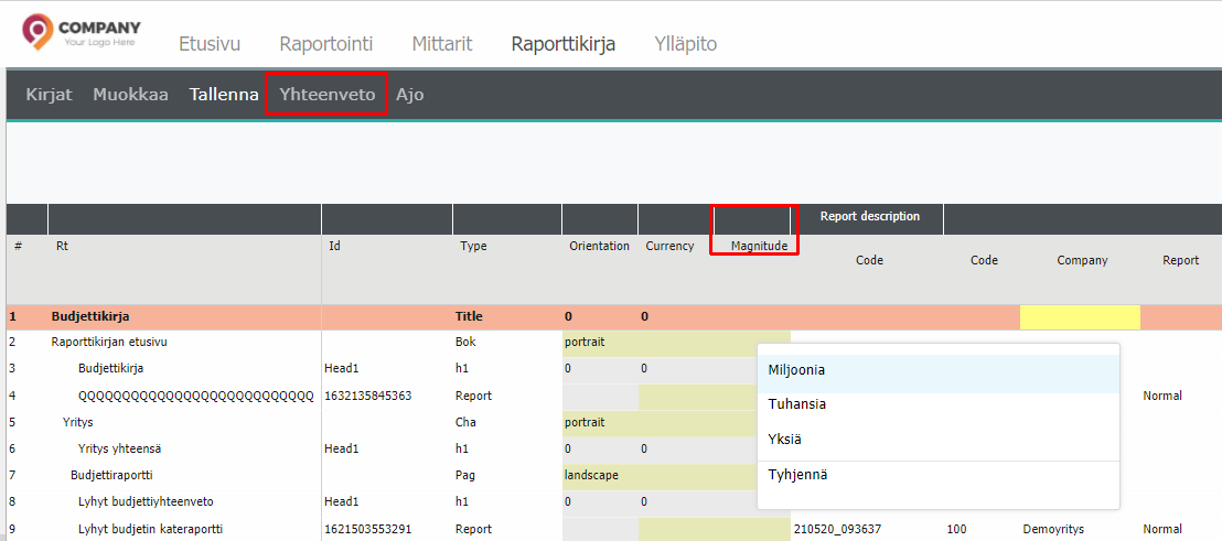 Raporttikirjaan tallennetut raportit / graafit tallennetaan aina ”perusyksikkömuodossa” eli yksinä euroina. Tarvittaessa kirjan tai sen sivujen numeroiden suuruusluokan (Magnitude) voi vaihtaa. Napsauta oikealla hiirellä esimerkiksi kirjan etusivun Magnitude saraketta ja valitse suuruusluokka.
