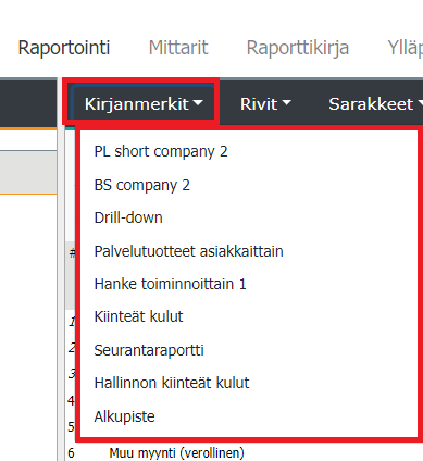 Kirjanmerkki on käyttäjän talteen ottama raportti, johon on tallennettu valitut suodattimet, kuten rivimalli, sarakemalli ja puurakenteesta valitut yksiköt. Kirjanmerkki vie käyttäjän aina tuoreeseen raportin tilaan. Kirjanmerkki ei siis ole staattinen raportti, joka esittäisi vain lukuja hetkestä, kun se otettiin talteen. Kirjanmerkkiin on tallennettu käyttäjän tekemät valinnat, jolloin käyttäjän ei tarvitse aina tehdä samoja valintoja uudestaan, kun hän selailee usein katsottuja raportteja. Käyttäjälle tallennetut kirjanmerkit ovat saatavilla Etusivulla tai Raportointi-alueen Kirjanmerkit-valikon alla.
