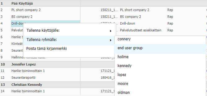 Kirjanmerkin tallennus toiselle käyttäjälle tai käyttäjäryhmälle tehdään klikkaamalla hiiren oikealla yksittäisen kirjanmerkin rivitekstiä ja valitsemalla joko käyttäjän tai käyttäjäryhmän, jolle kirjanmerkki tallennetaan. Valinnan jälkeen kirjanmerkki tallentuu käyttäjälle tai käyttäjäryhmälle ja näkyy heti yhteenvedot taulukossa. Kirjanmerkin tallennuksessa loppukäyttäjälle on huomioitava, jos loppukäyttäjälle aiotaan tallentaa kirjanmerkki, joka ylittää hänen käyttöoikeutensa, niin Tabella estää kirjanmerkin tallennuksen käyttäjälle.