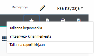 Raportin saa tallennettua kirjanmerkiksi painamalla -painiketta ja valitsemalla Tallenna kirjanmerkki. Tämän jälkeen Tabella pyytää antamaan nimen uudelle kirjanmerkille, jonka jälkeen uusi kirjanmerkki on luotu.